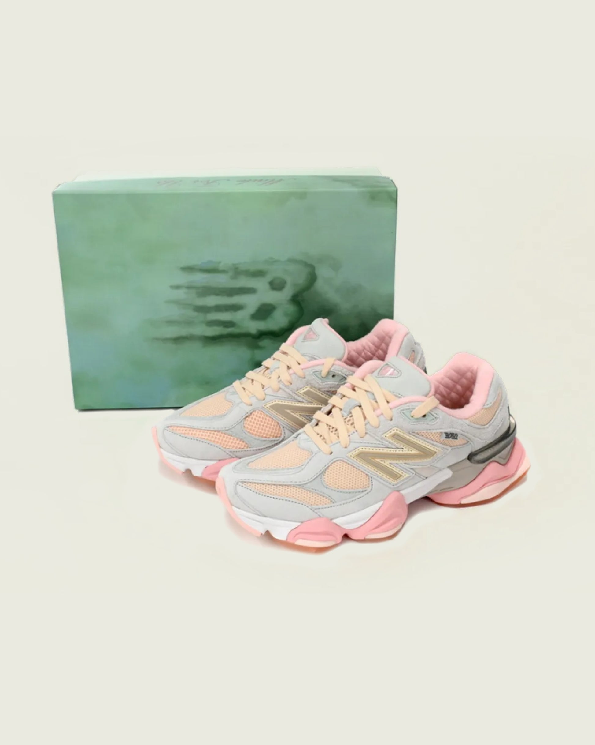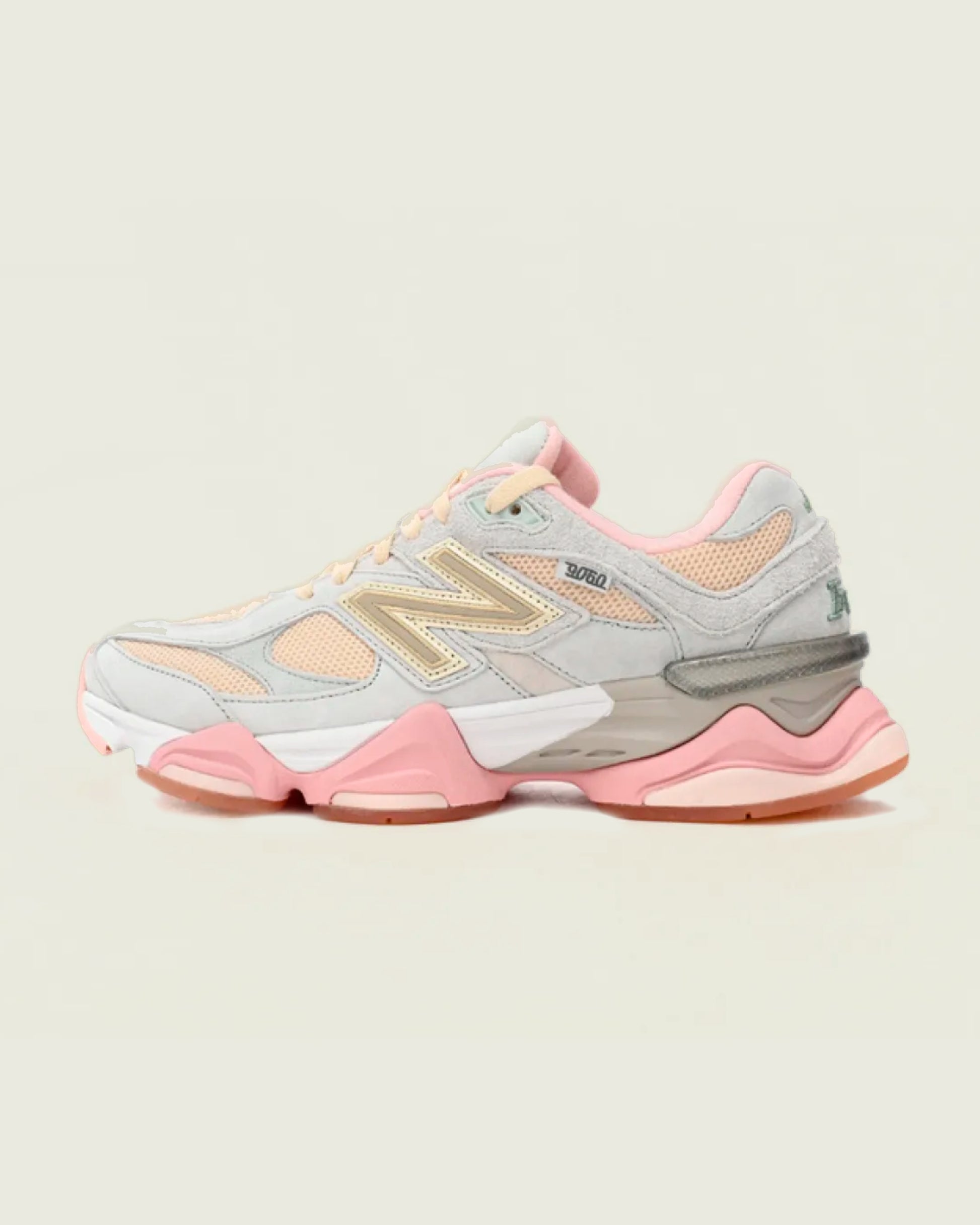El New Balance 9060 Joe Freshgoods Inside Voices Cookie Pink presenta una construcción de malla Cookie Pink con superposiciones de gamuza marrón claro y logotipos de New Balance a juego. En el talón, el sutil bordado "Inside Voices" se destaca en un estilo monótono.